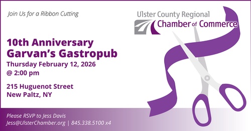 The Ulster County Regional Chamber of Commerce is conducting a Ribbon Cutting Ceremony celebrating the 10th Anniversary of Garvan's Gastropub at 215 Huguenot Street, New Paltz, NY.